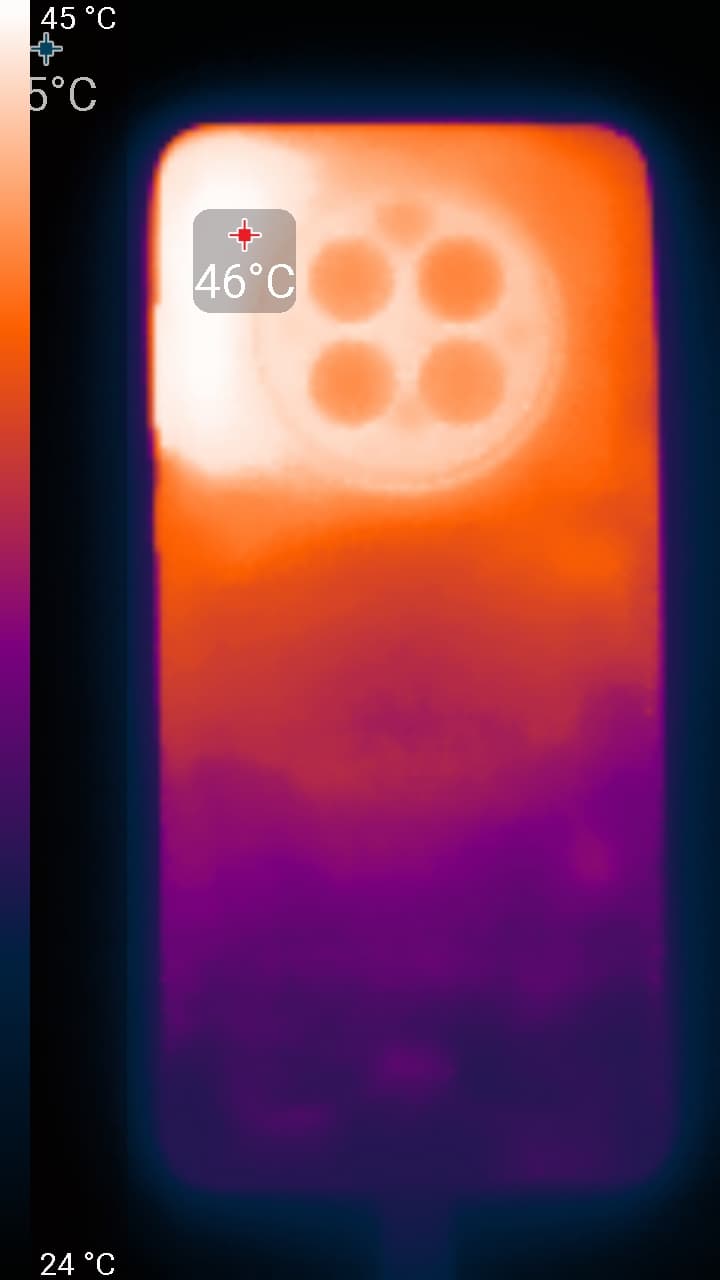 Нагрев больше в верхней правой части аппарата, что, видимо, соответствует расположению микросхемы SoC. По данным теплокамеры, максимальный нагрев составил 46 градусов (при температуре окружающего воздуха в 24 градуса), это невысокий нагрев в случае данного теста в сравнении с другими современными производительными смартфонами. Умеренный нагрев явно обусловлен сильным снижением производительности.