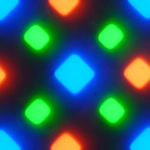 В этом экране используется матрица AMOLED — активная матрица на органических светодиодах. Полноцветное изображение создается с помощью субпикселей трех цветов — красного (R), зеленого (G) и синего (B), но красных и синих субпикселей в два раза меньше, что можно обозначить как RGBG. Это подтверждается фрагментом микрофотографии: