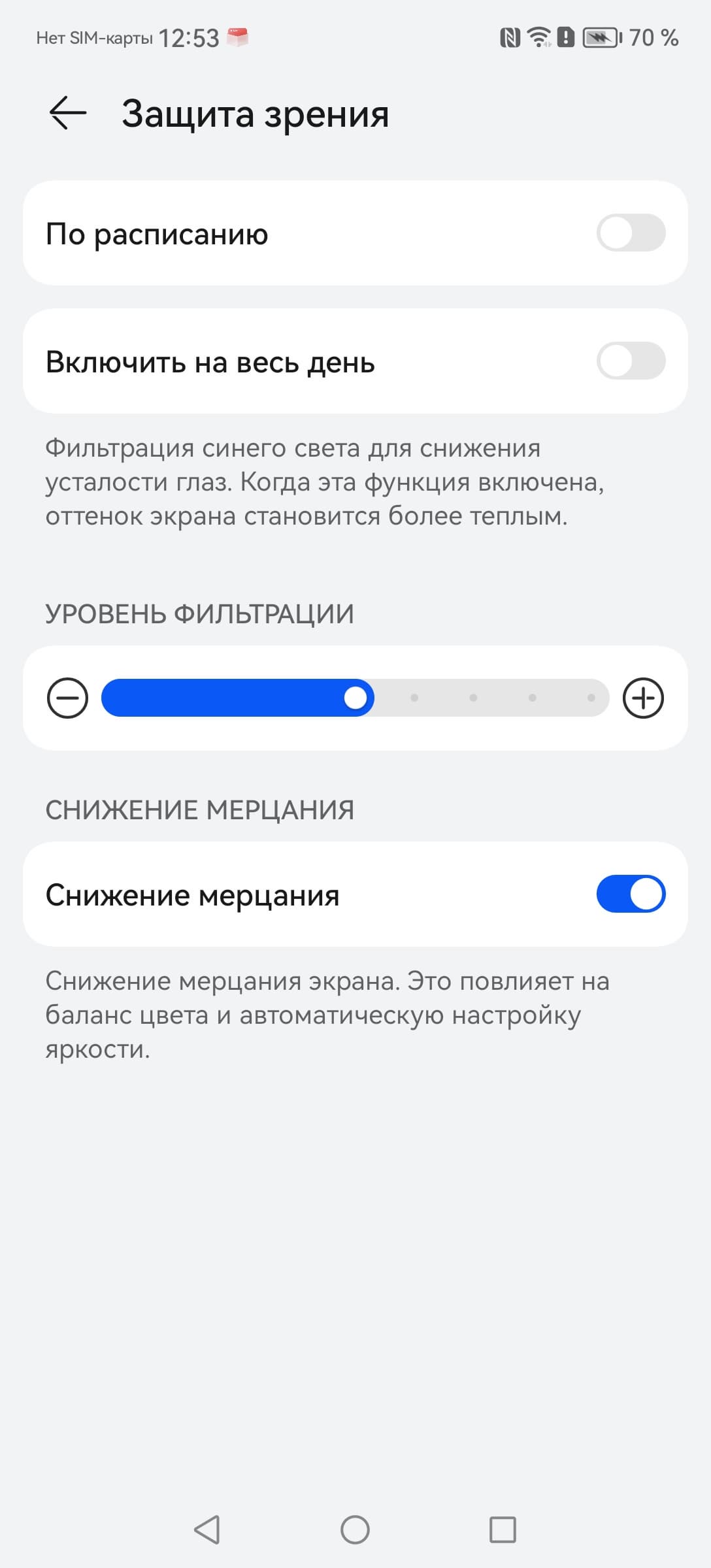 Разумеется есть функция снижения интенсивности синей компоненты (снимок экрана с настройкой был выше). В ее описании, конечно, приведена дезинформация про усталость глаз. В принципе, яркий свет может приводить к нарушению суточного (циркадного) ритма (см. статью про iPad Pro с дисплеем 9,7 дюйма), но все решается снижением яркости до низкого, но еще комфортного уровня, а искажать цветовой баланс, уменьшая вклад синего, нет абсолютно никакого смысла.