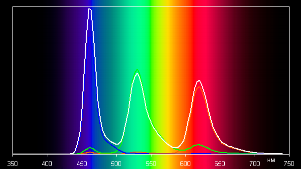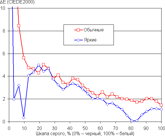 В этом устройстве есть возможность скорректировать цветовой баланс с помощью выбора профиля цветовой температуры или регулировки оттенка на цветовом круге. Впрочем, в случае профиля Обычные цвета даже без коррекции баланс оттенков на шкале серого хороший, так как цветовая температура близка к стандартным 6500 К, и отклонение от спектра абсолютно черного тела (ΔE) ниже 10 единиц, что для потребительского устройства считается приемлемым показателем. При этом цветовая температура и ΔE мало изменяются от оттенка к оттенку — это положительно сказывается на визуальной оценке цветового баланса. (Самые темные области шкалы серого можно не учитывать, так как там баланс цветов не имеет большого значения, да и погрешность измерений цветовых характеристик на низкой яркости большая.)