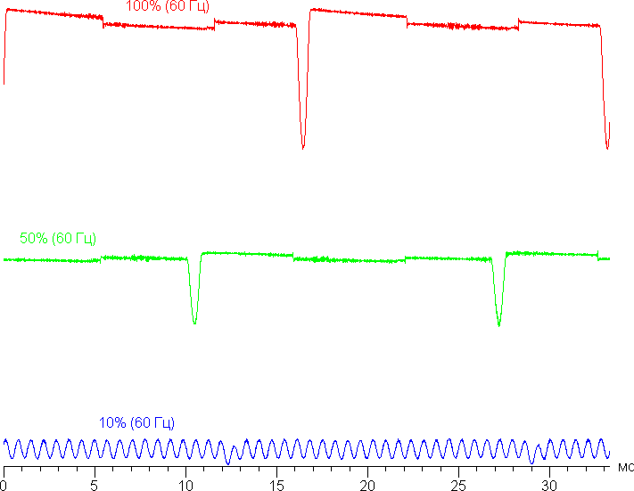 На высоком и среднем уровне яркости присутствует значимая модуляция с частотой примерно 60 или 90 Гц. На рисунке ниже приведены зависимости яркости (вертикальная ось) от времени (горизонтальная ось) для нескольких значений настройки яркости. Сначала для режима с частотой обновления 60 Гц: