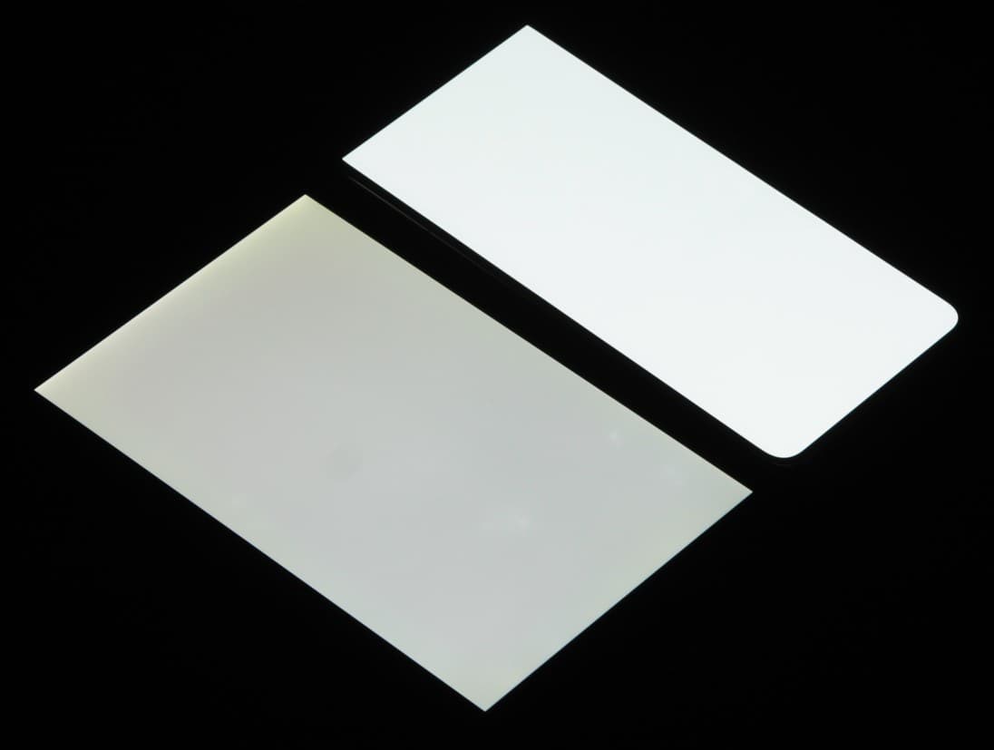 Экран характеризуется великолепными углами обзора. Правда, белый цвет при отклонении на большие углы приобретает едва заметный сине-зеленый оттенок. Черный цвет остается просто черным под любыми углами. Он настолько черный, что параметр контрастности в данном случае неприменим. Для сравнения приведем фотографии, на которых на экраны Huawei Mate 50 и второго участника сравнения выведены одинаковые изображения, при этом яркость экранов изначально установлена примерно на 200 кд/м², а цветовой баланс на фотоаппарате принудительно переключен на 6500 К.