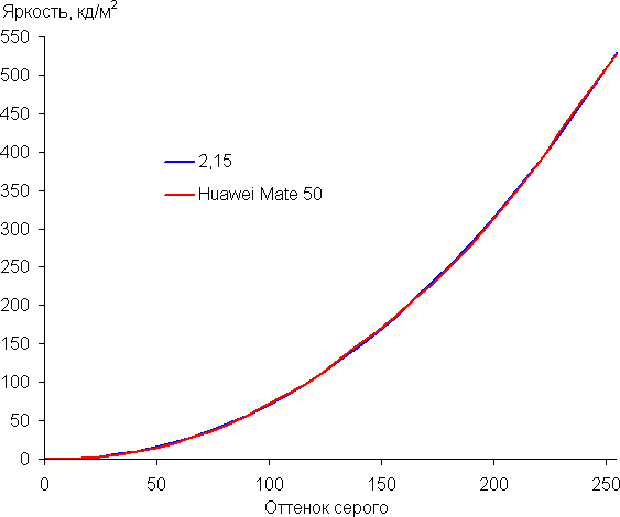 Напомним, что в случае OLED-экранов яркость фрагментов изображения динамично меняется в соответствии с характером выводимого изображения — чуть уменьшается для светлых в целом изображений. В итоге полученная зависимость яркости от оттенка (гамма-кривая), скорее всего, не соответствует гамма-кривой статичного изображения, так как измерения проводились при последовательном выводе оттенков серого почти на весь экран.