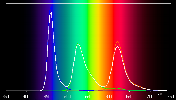В первом случае спектры компонент (то есть спектры чистых красного, зеленого и синего цветов) очень хорошо разделены: