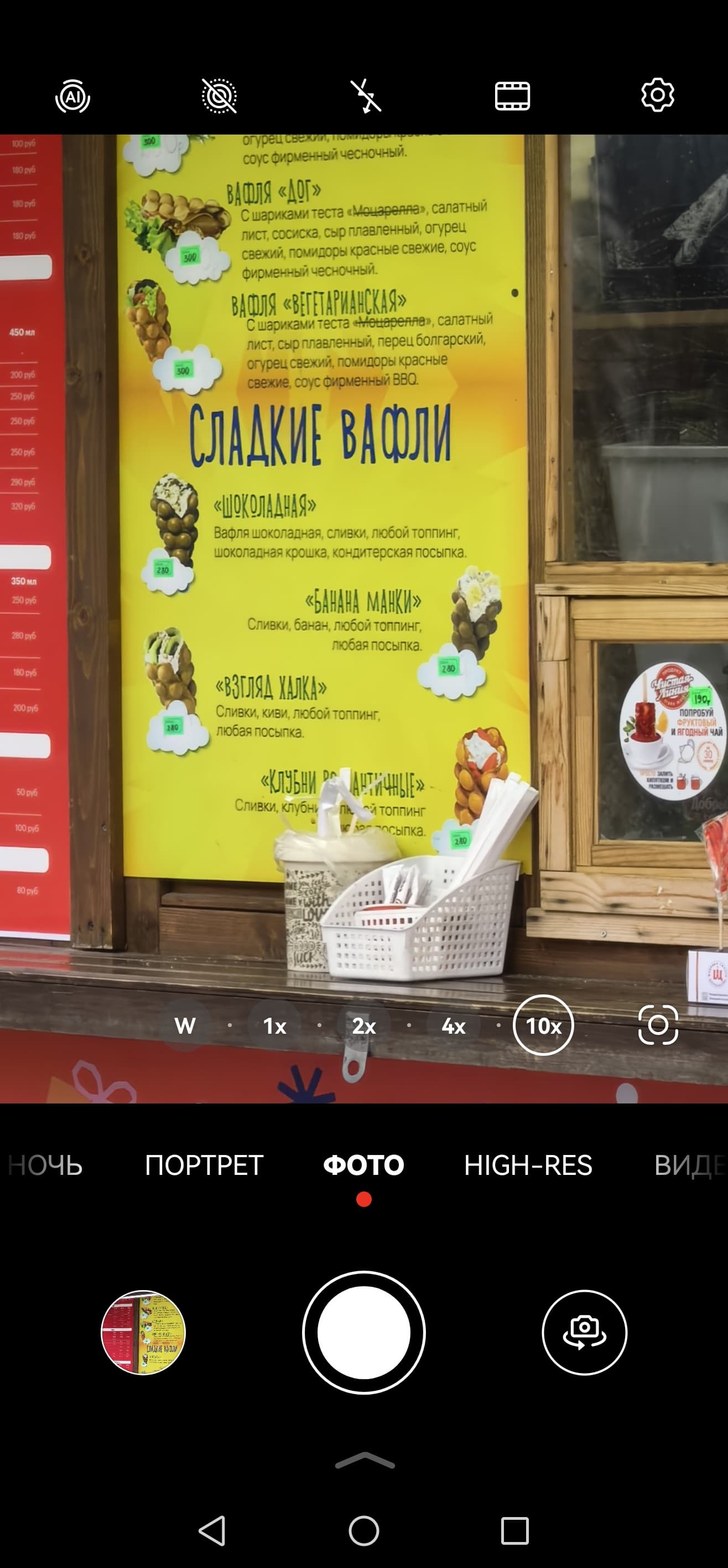 Основная камера с переменной диафрагмой, автоматически выставляемой в зависимости от уровня освещения и отдаленности объекта, имеет фазовый автофокус и оптический стабилизатор. По умолчанию она выдает снимки в разрешении 12 Мп, но можно переключиться и в режим съемки 50 Мп. К сожалению, у протестированного нами смартфона на полноразмерных снимках проявлялся дефект обработки, местами превращающий однородные поверхности в полосатый растр. Высочайший уровень детализации всё равно очевиден, но все-таки до программного исправления этой проблемы рекомендовать съемку в 50 Мп ради более качественной передачи деталей странно.