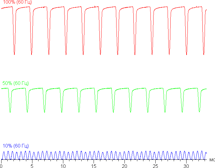 На высоком и среднем уровне яркости присутствует значимая модуляция с частотой 360 Гц. На рисунках ниже приведены зависимости яркости (вертикальная ось) от времени (горизонтальная ось) для нескольких значений настройки яркости: