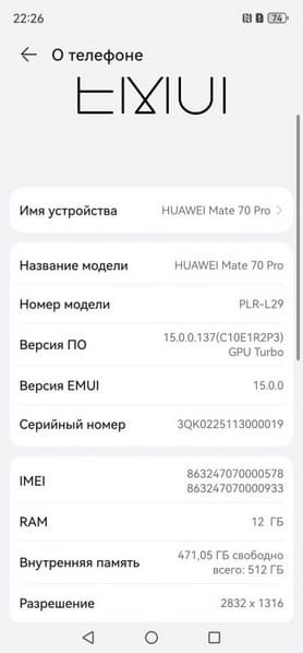 Основные характеристики Huawei Mate 70 Pro (модель PLR-L29)