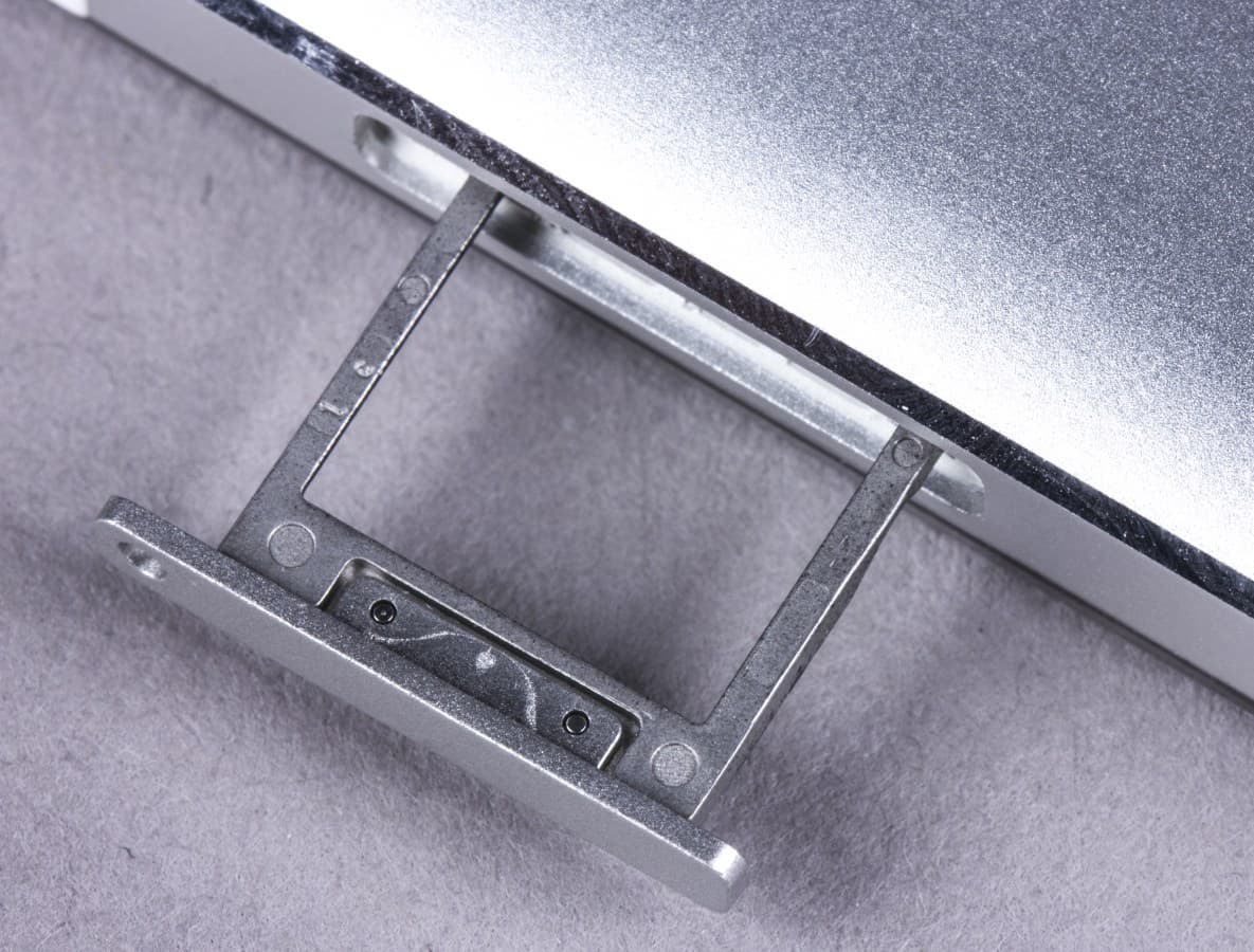 С той же стороны по краям разнесены два выдвижных лотка — для карт Micro-SIM и microSD. Внешне их сложно различить, поскольку никаких пометок нет, а размеры их практически одинаковы. Но все же верхний лоток, предназначенный для карты памяти, чуть меньше по размеру.