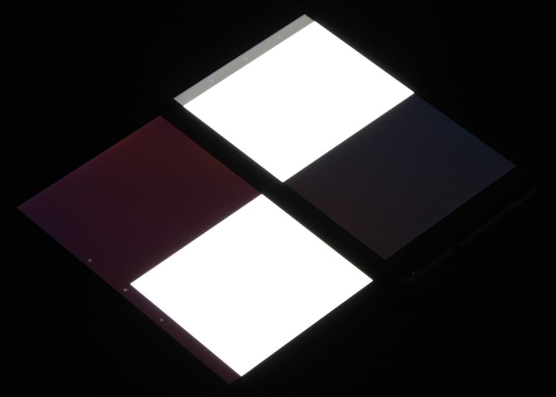 Яркость под углом у обоих планшетов заметно уменьшилась (как минимум в 5 раз, исходя из разницы в выдержке) и уменьшилась примерно на одинаковую величину. Черное поле при отклонении по диагонали высветляется слабо и приобретает фиолетовый или красно-фиолетовый оттенок. Фотография с Nexus 7 для сравнения это показывает (яркость белых участков в перпендикулярном направлении у обоих планшетов примерно одинаковая):
