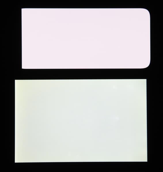 Цветопередача хорошая, цвета в меру насыщенные, цветовой баланс у экранов немного различается. Напомним, что фотография не может служить надежным источником сведений о качестве цветопередачи и приводится только для условной наглядной иллюстрации. В частности, выраженный красноватый оттенок белого и серого полей, присутствующий на фотографиях экрана смартфона, при перпендикулярном взгляде визуально отсутствует, что подтверждается аппаратными тестами с помощью спектрофотометра. Причина в том, что спектральная чувствительность матрицы фотоаппарата неточно совпадает с этой характеристикой человеческого зрения.