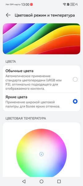 Цветовой охват зависит от выбранного профиля (Яркие цвета или Обычные цвета), от прописанного профиля в самом изображении, также от программы, которая выводит изображение на экран смартфона. В профиле Яркие цвета охват немного уширен относительно прописанного в изображении, тогда как в профиле Обычные цвета охват по возможности соответствует прописанному в изображении. Если профиля в изображении нет, то считается, что оно соответствует sRGB. ПО, которое выводит изображение на экран, должно иметь информацию о возможностях экрана. К примеру Google Chrome поддерживает профили в изображении, но считает, что экран sRGB. Тогда как штатная программа Галерея знает о возможностях экрана.