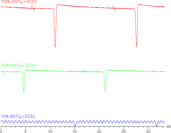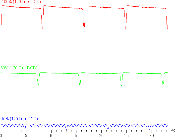 В англоязычной литературе и в новостях обычно используют название DC Dimming (на графиках сократим до DCD). При включении этой функции меняется только характер модуляции на низкой яркости. Видимого мерцания как не было, так и нет. Приведем графики: