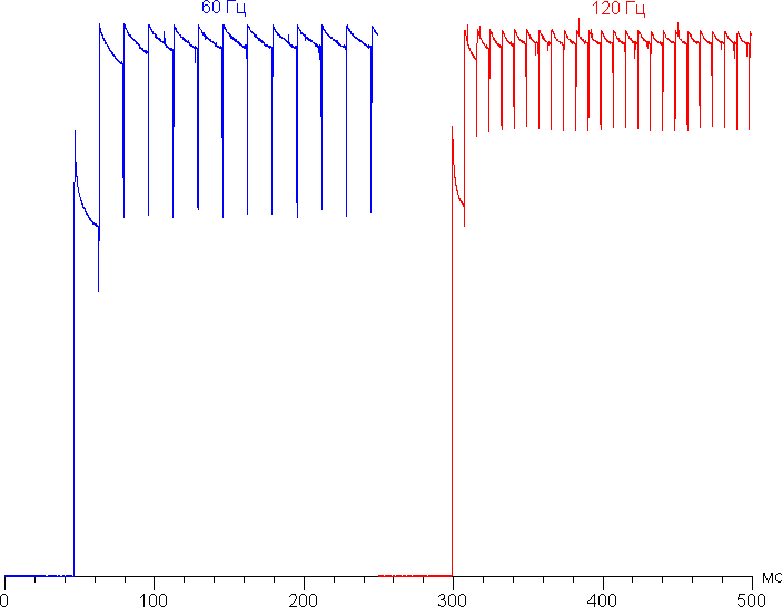 Переключение состояния элементов матрицы выполняется практически мгновенно, но на фронте включения может присутствовать ступенька шириной примерно 17 мс (что соответствует частоте обновления экрана примерно в 60 Гц) или примерно 8 мс (120 Гц). Например, так выглядит зависимость яркости от времени при переходе от черного к белому: