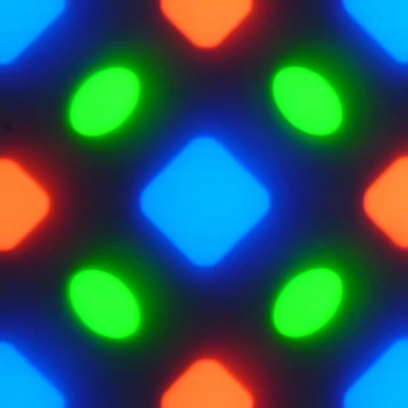 В этом экране используется матрица AMOLED — активная матрица на органических светодиодах. Полноцветное изображение создается с помощью субпикселей трех цветов — красного (R), зеленого (G) и синего (B), но красных и синих субпикселей в два раза меньше, что можно обозначить как RGBG. Это подтверждается фрагментом микрофотографии: