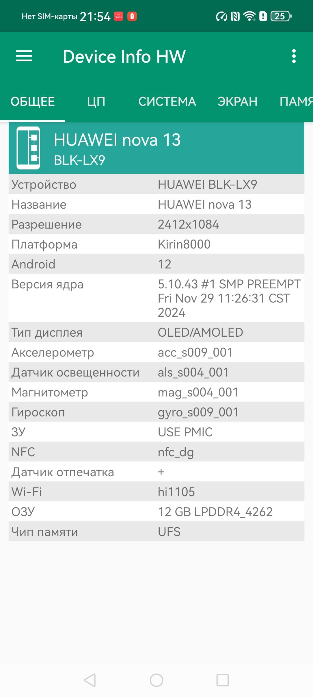 У смартфона Huawei nova 13 следующие сетевые возможности: поддерживаются сети вплоть до 5G, два диапазона Wi-Fi 6 и Bluetooth 5.2, есть поддержка NFC. На практике в пределах городской черты московского региона аппарат демонстрирует уверенную работу в беспроводных сетях, не теряет связь, быстро восстанавливает связь после вынужденного обрыва. Все необходимые встроенные датчики, вплоть до гироскопа, на месте.