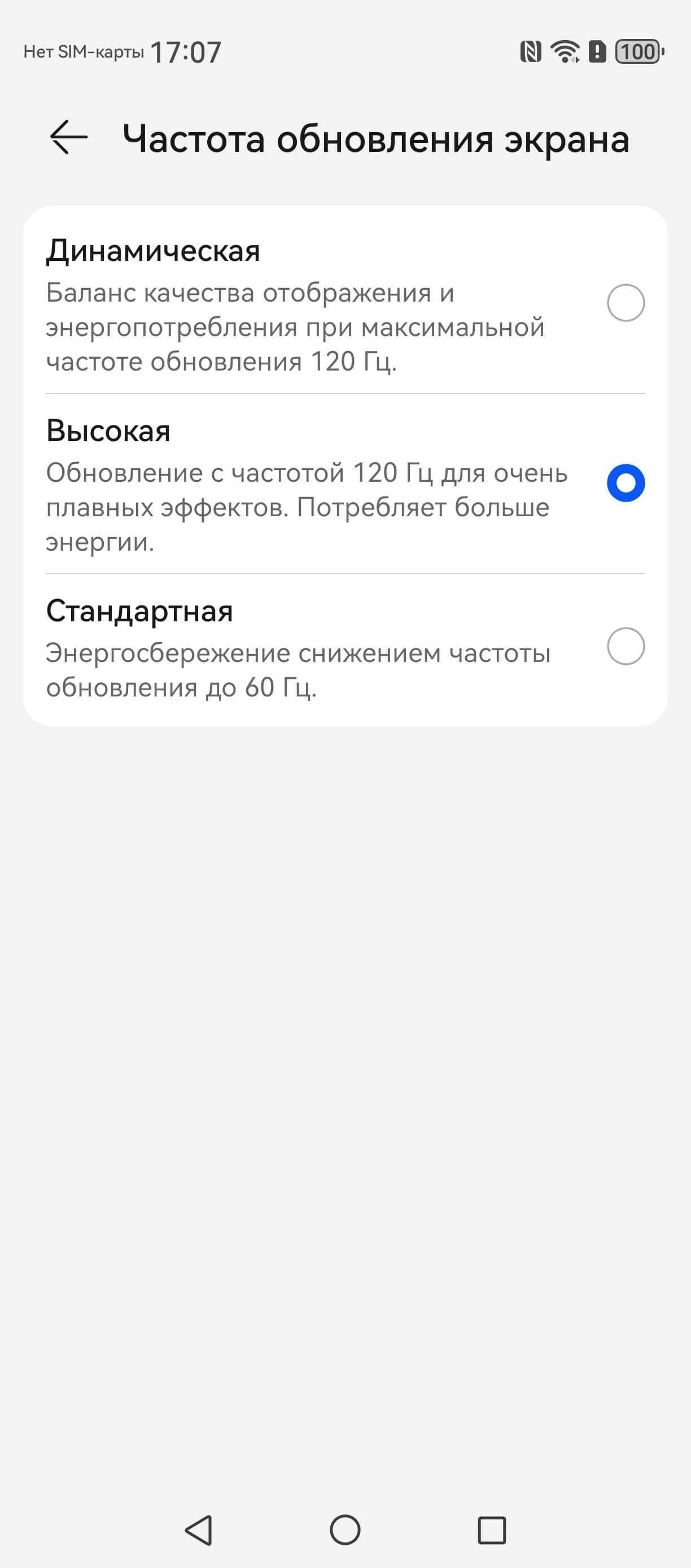 В этом режиме плавность прокрутки (списков в меню и т. д.) повышается. Характер модуляции при этом не меняется. Видимого мерцания все также нет. По факту режим всегда динамичный и на статичных изображениях, и если не касаться экрана, то частота обновления может снижаться до 60 Гц (по данным мониторинга). Данной настройкой пользователь ограничивает только максимальную частоту обновления.
