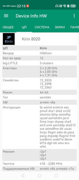 - SoC Kirin 8020 (неофициальные данные), 8 процессорных ядер (1×Taishan V121 2,29 ГГц + 3×Taishan V121 2,05 ГГц + 4×Taishan Little 1,3 ГГц)