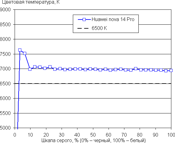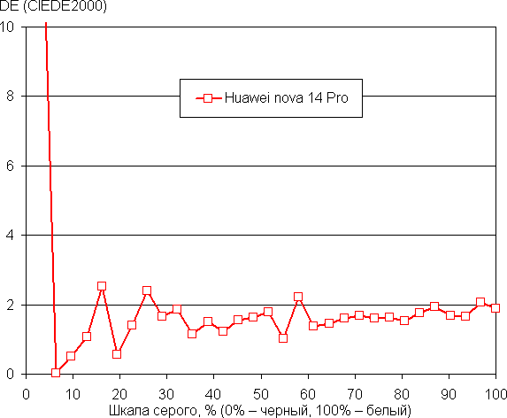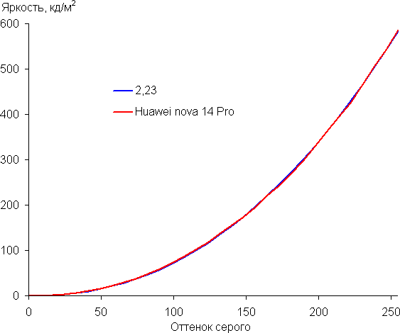 Напомним, что в случае OLED-экранов яркость фрагментов изображения динамично меняется в соответствии с характером выводимого изображения — чуть уменьшается для светлых в целом изображений. В итоге полученная зависимость яркости от оттенка (гамма-кривая), скорее всего, не соответствует гамма-кривой статичного изображения, так как измерения проводились при последовательном выводе оттенков серого почти на весь экран.