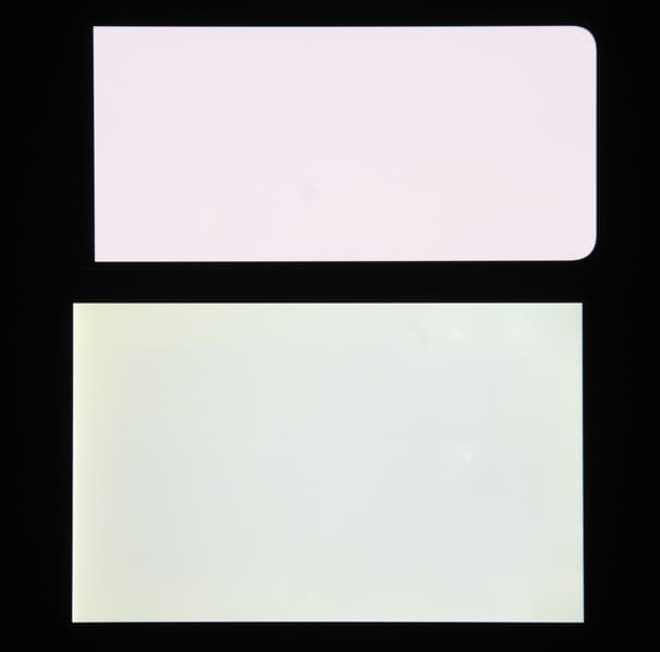 Экран характеризуется великолепными углами обзора. Яркость под углом у обоих экранов заметно уменьшается (если сравнивать с Nexus 7), но в случае смартфона падение яркости выражено гораздо меньше. В итоге, даже если установить формально одинаковую яркость, то экран этого смартфона визуально выглядит гораздо более ярким (в сравнении с ЖК-экранами), так как на экран мобильного устройства часто приходится смотреть как минимум под небольшим углом. Правда, у смартфона белый цвет при отклонении на большие углы приобретает легкий сине-зеленый оттенок, но черный цвет остается просто черным под любыми углами. Он настолько черный, что параметр контрастности в данном случае неприменим. Для сравнения приведем фотографии, на которых на экраны смартфона и второго участника сравнения выведены одинаковые изображения, при этом яркость экранов изначально установлена примерно на 200 кд/м², а цветовой баланс на фотоаппарате принудительно переключен на 6500 К.