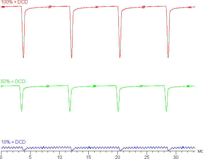 В англоязычной литературе и в новостях обычно используют название DC Dimming (на графиках сократим до DCD). При включении этой функции слегка меняется только характер модуляции на низкой яркости. Видимого мерцания как не было, так и нет. Приведем графики: