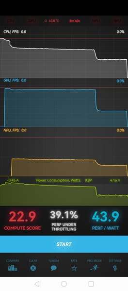 Тест на снижение производительности при нагреве мы проводим с помощью программы Burnout Benchmark, которая позволяет нагружать CPU, GPU и NPU.