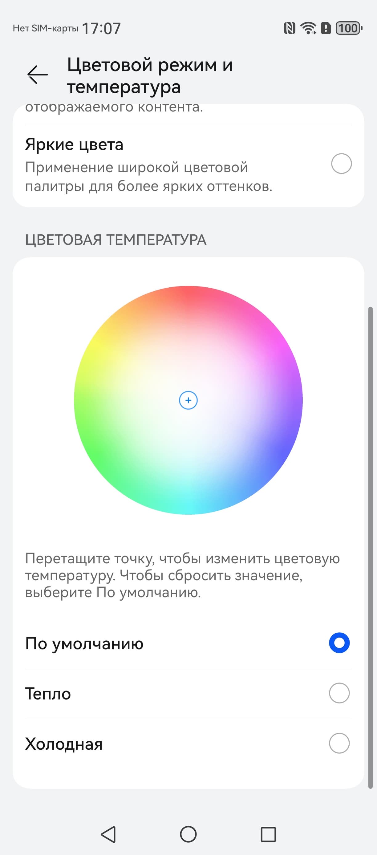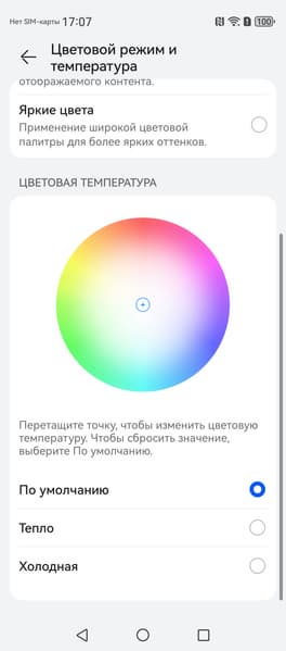 В этом устройстве есть возможность скорректировать цветовой баланс с помощью выбора профиля цветовой температуры или регулировки оттенка на цветовом круге.