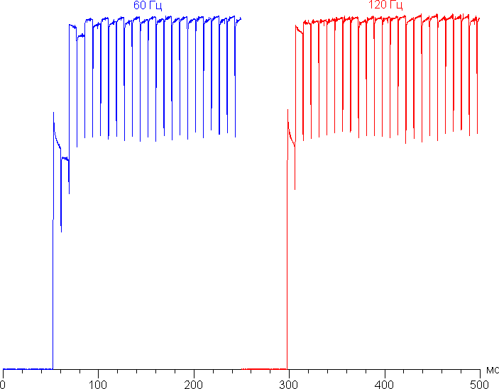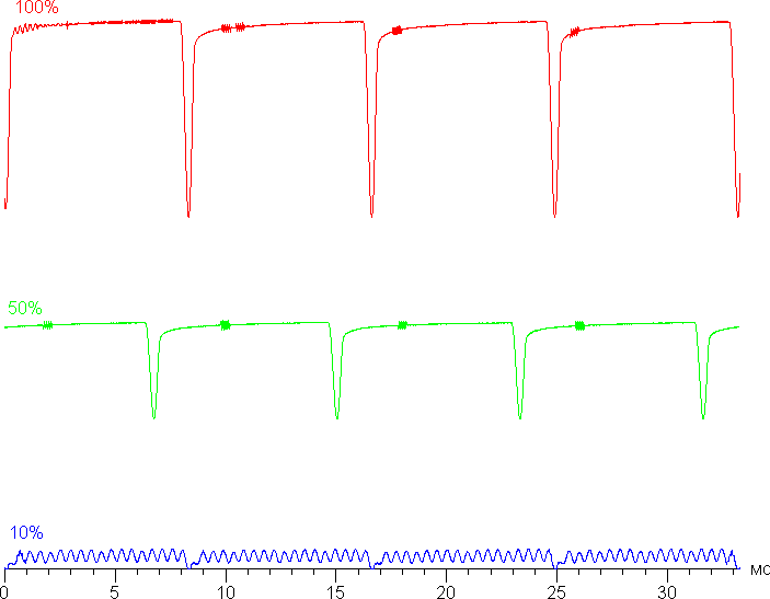 На любом уровне яркости присутствует значимая модуляция с частотой 120 Гц. На рисунках ниже приведены зависимости яркости (вертикальная ось) от времени (горизонтальная ось) для нескольких значений настройки яркости. Сначала для режима с частотой обновления 60 Гц: