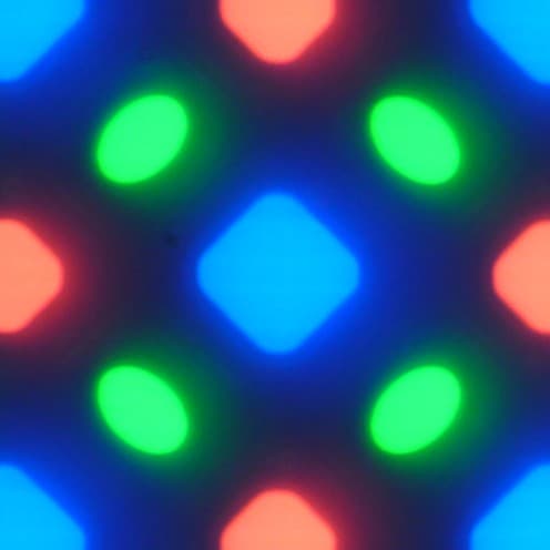 В этом экране используется матрица AMOLED — активная матрица на органических светодиодах. Полноцветное изображение создается с помощью субпикселей трех цветов — красного (R), зеленого (G) и синего (B), но красных и синих субпикселей в два раза меньше, что можно обозначить как RGBG. Это подтверждается фрагментом микрофотографии: