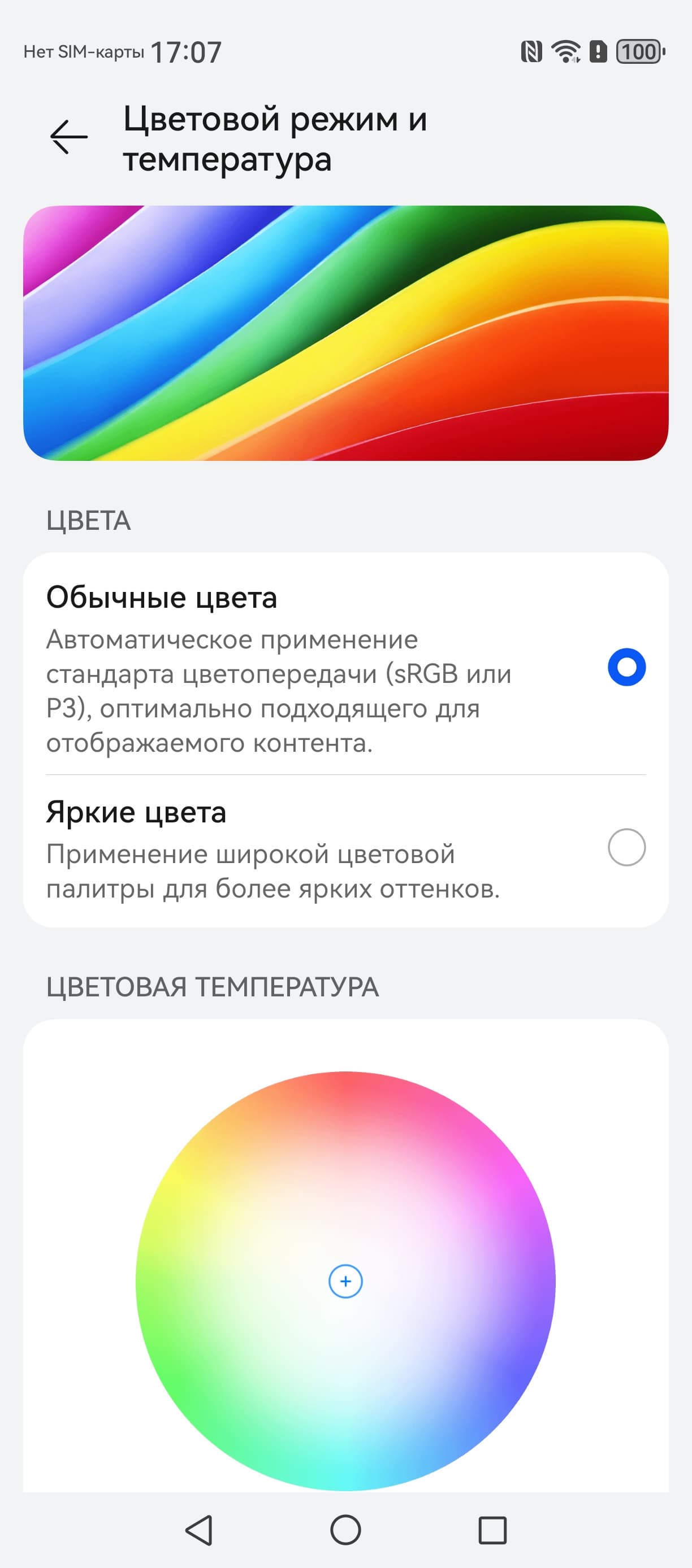 Цветовой охват в случае изображения с профилем DCI-P3 при выбранном профиле Яркие цвета и при выводе в ПО Галерея самый широкий, немного шире DCI-P3, а в случае изображения с профилем sRGB при выбранном профиле Обычные цвета и при выводе в ПО Галерея или Google Chrome — близок к sRGB: