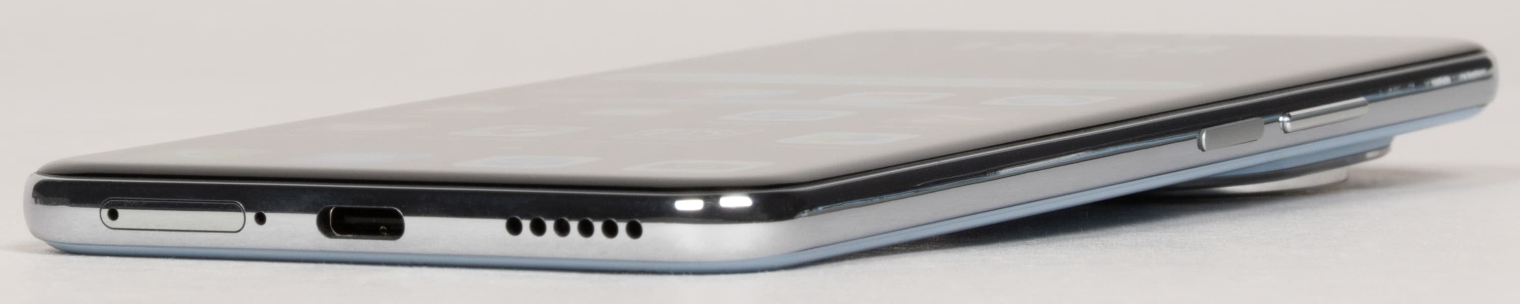 В выдвижной лоток на нижнем торце можно установить две карты Nano-SIM (с одной и с другой стороны салазок). Для карты памяти microSD место не предусмотрено. Также на нижнем торце размещены динамик, микрофон и разъем USB Type-C.