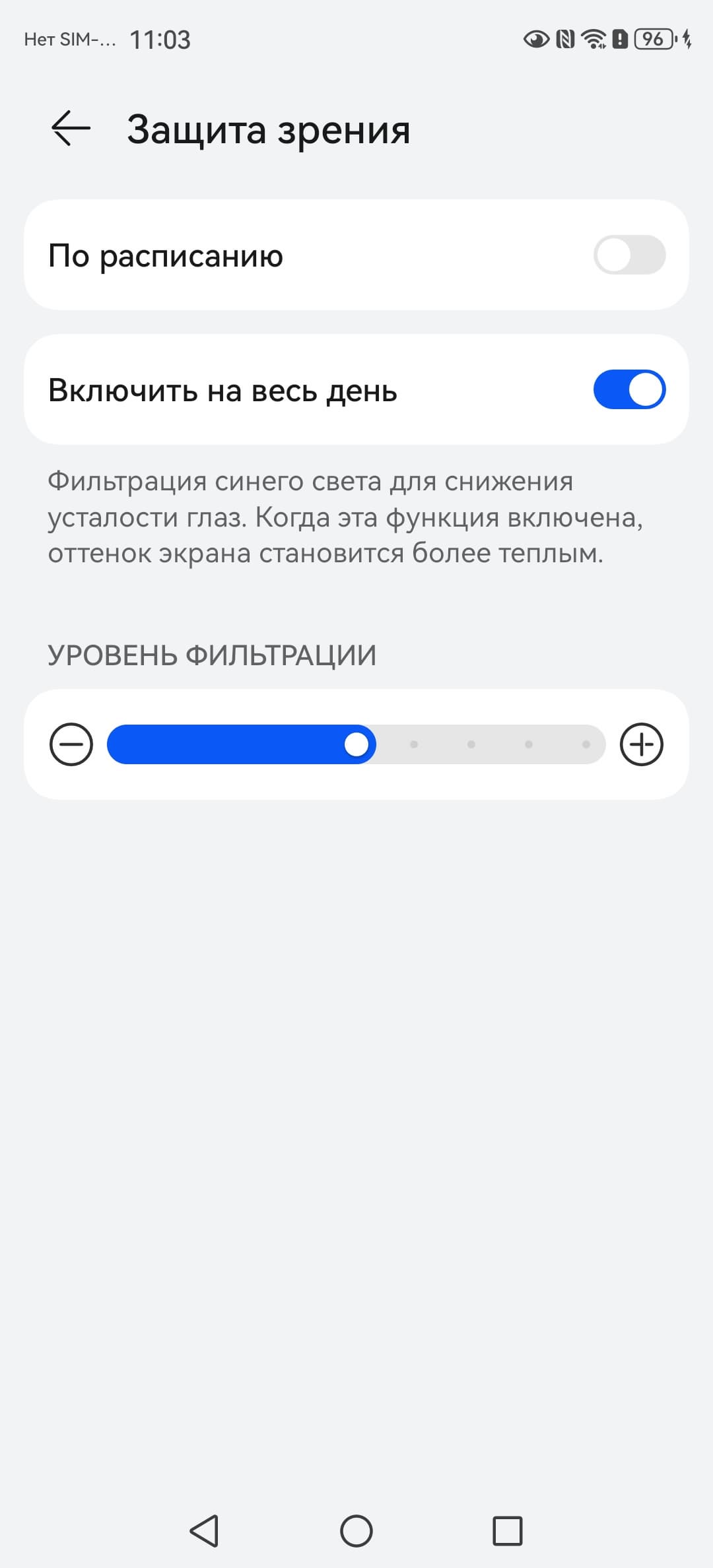 Заявления насчет усталости глаз мы оставим на совести производителя. В принципе, яркий свет может приводить к нарушению суточного (циркадного) ритма (см. статью про iPad Pro с дисплеем 9,7 дюйма), но все решается снижением яркости до низкого, но еще комфортного уровня, а искажать цветовой баланс, уменьшая вклад синего, нет абсолютно никакого смысла.