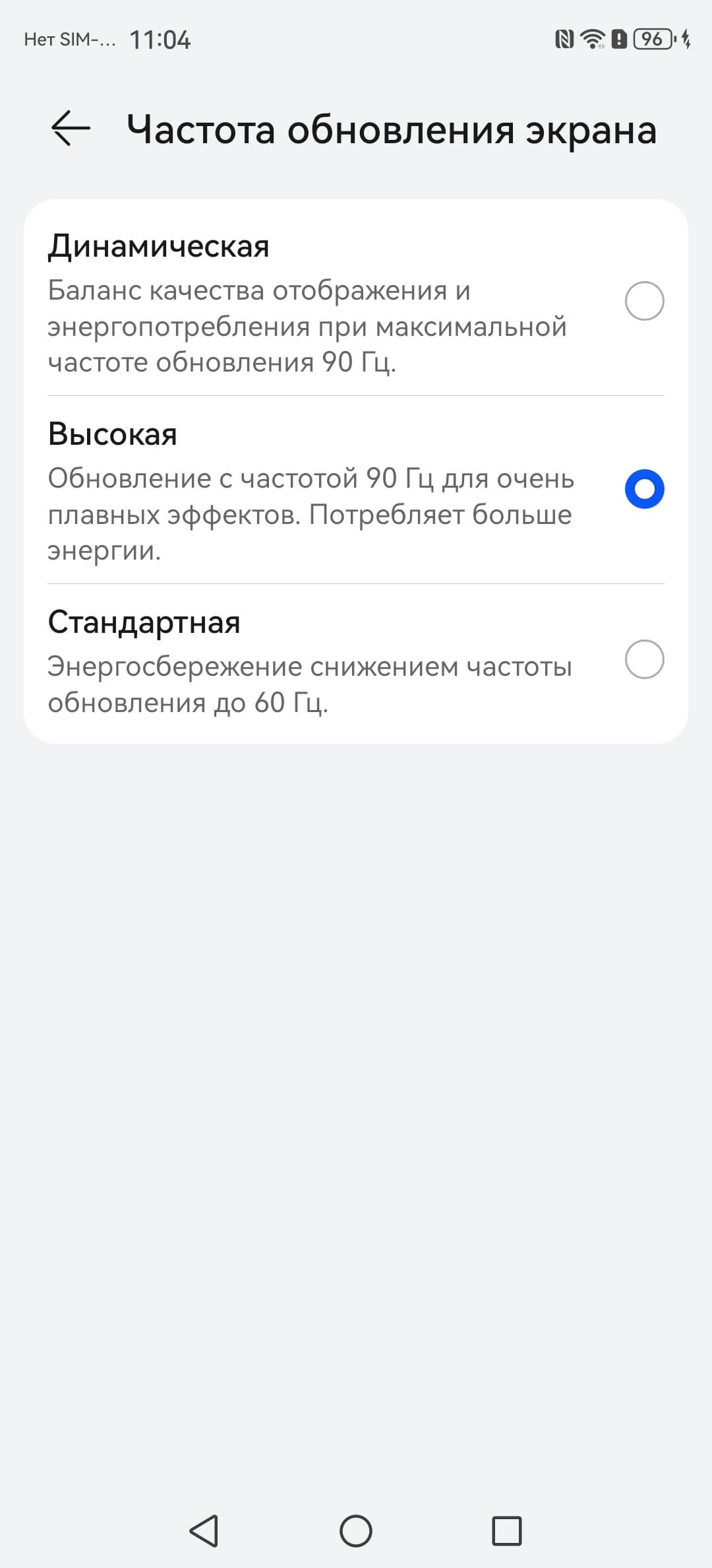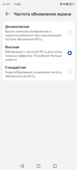В настройках экрана можно включить режимы с повышенной до 90 Гц частотой обновления, притом в режиме Динамическая нам обещают автоматический выбор частоты:
