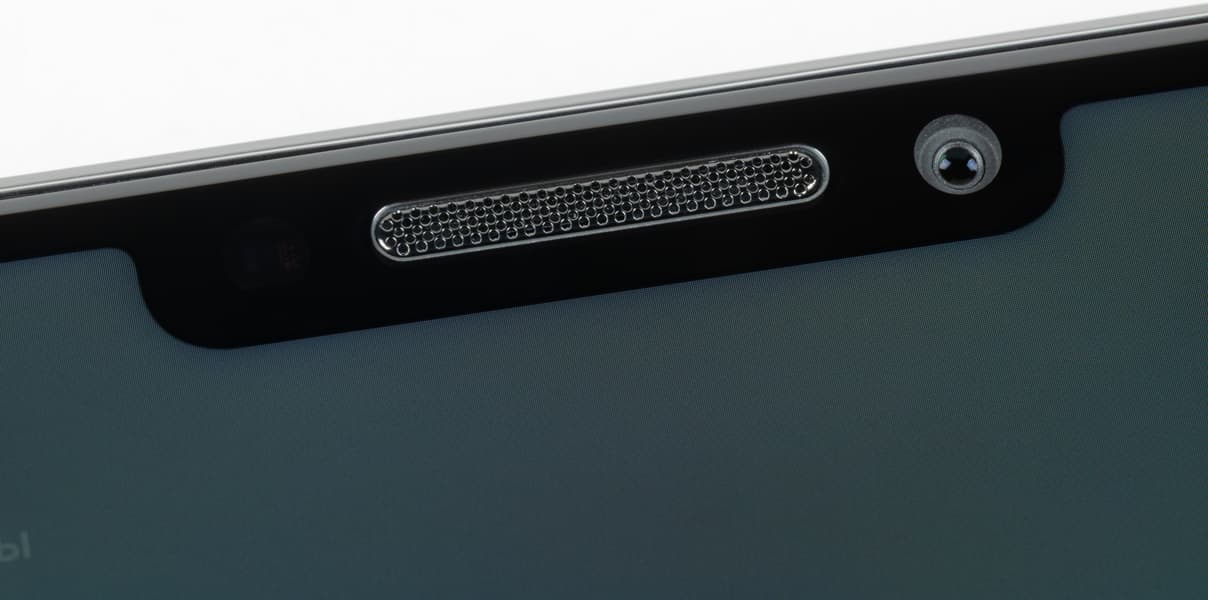 Переднее стекло плоское, с достаточно широкой по современным меркам рамкой вокруг дисплея. При этом фасад смотрится максимально интересно за счет того, что камера установлена не в круглом вырезе, а вместе с решеткой динамика за широкой выемкой «монобровью».