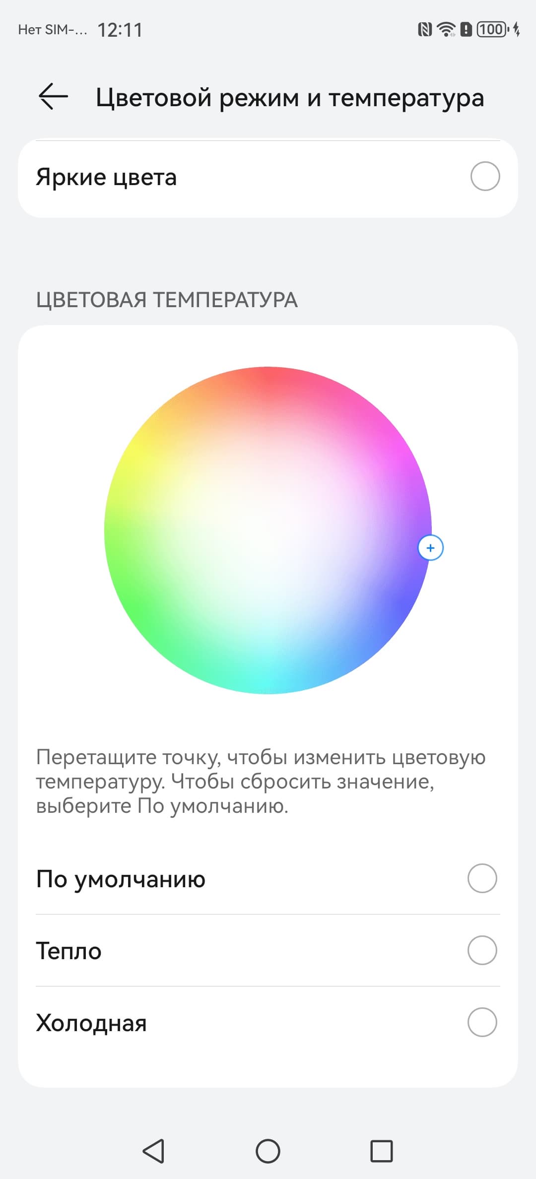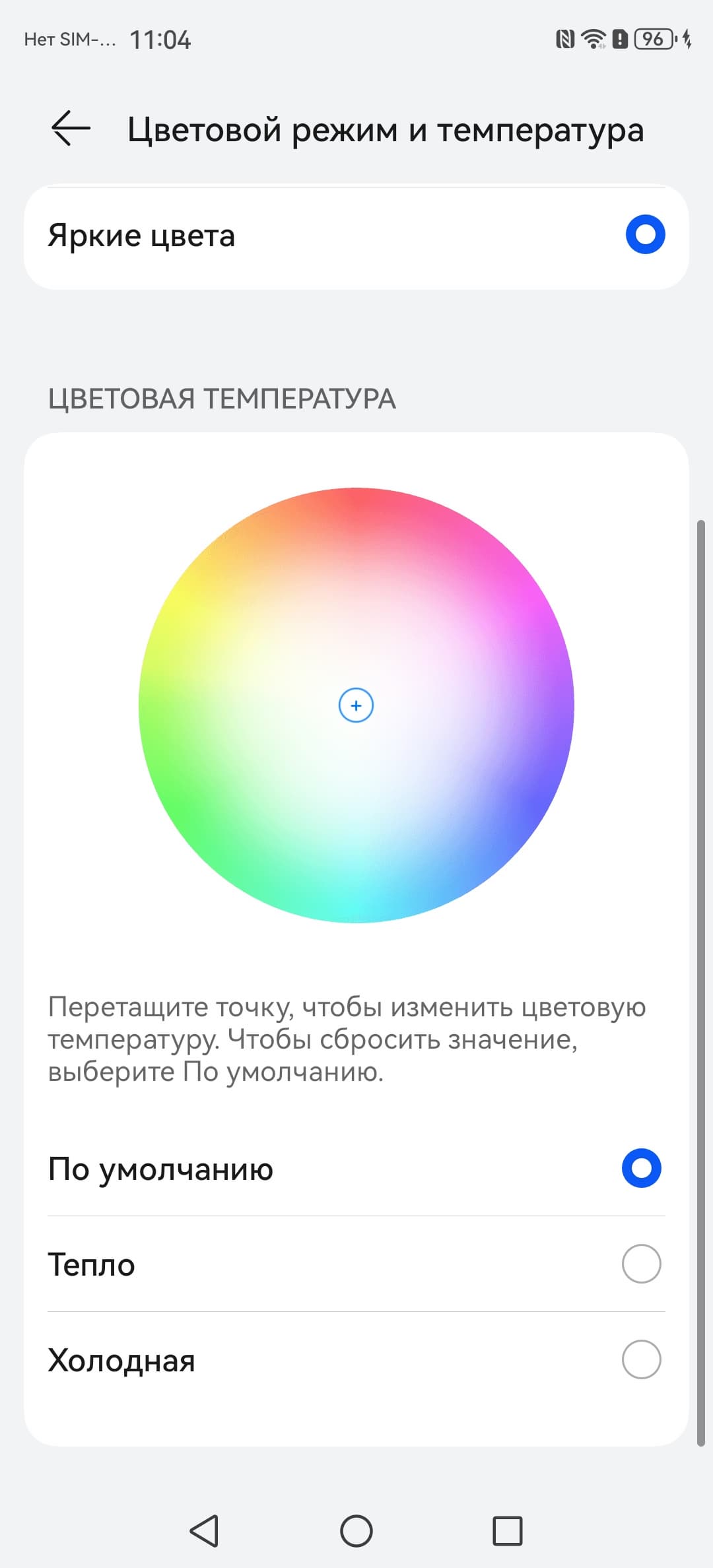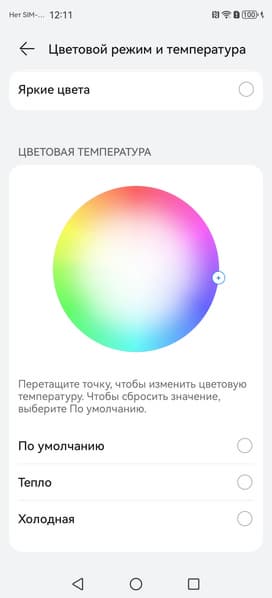 В этом устройстве есть возможность скорректировать цветовой баланс с помощью выбора профиля цветовой температуры или регулировки оттенка на цветовом круге.