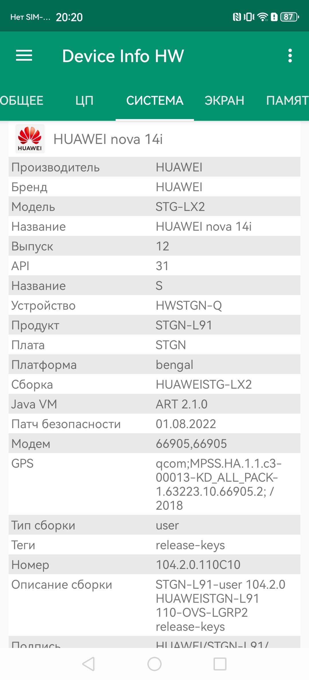 Основные характеристики Huawei nova 14i (модель STG-LX2)