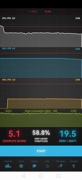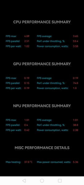 Тест на снижение производительности при нагреве мы проводим с помощью программы Burnout Benchmark, которая позволяет нагружать CPU, GPU и NPU. Уровень тротлинга GPU сравнительно невысок, но это единственное достоинство SoC.