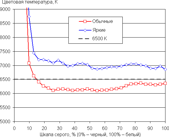 Баланс оттенков на шкале серого после выбора профиля Обычные цвета без коррекции компромиссный, так как цветовая температура заметно ниже стандартных 6500 К — порядка 6030 К, а в случае профиля Яркие цвета выше — 7940 К.