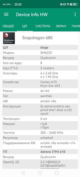 - SoC Qualcomm Snapdragon 680 4G, 8 процессорных ядер (4×Cortex-A73 @2,4 ГГц + 4×Cortex-A53 @1,9 ГГц)