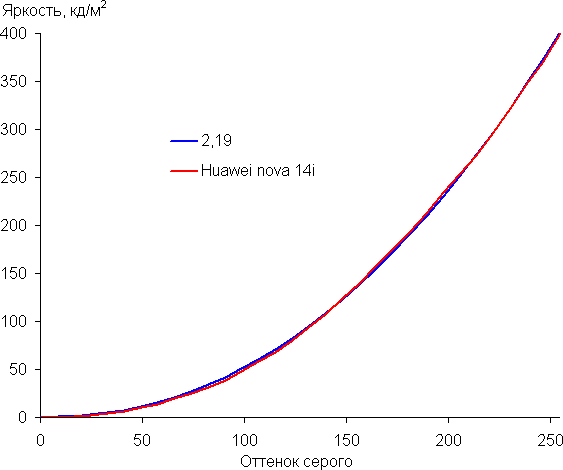 Контрастность (примерно в центре экрана) высокая — порядка 1200:1. Время отклика при переходе черный-белый-черный равно 15 мс (7 мс вкл. + 8 мс выкл.). Переход между полутонами серого 25% и 75% (по численному значению цвета) и обратно в сумме занимает 26 мс. Построенная по 32 точкам с равным интервалом по численному значению оттенка серого гамма-кривая не выявила завала ни в светах, ни в тенях. Показатель аппроксимирующей степенной функции равен 2,19, что очень близко к стандартному значению 2,2. При этом реальная гамма-кривая мало отклоняется от степенной зависимости: