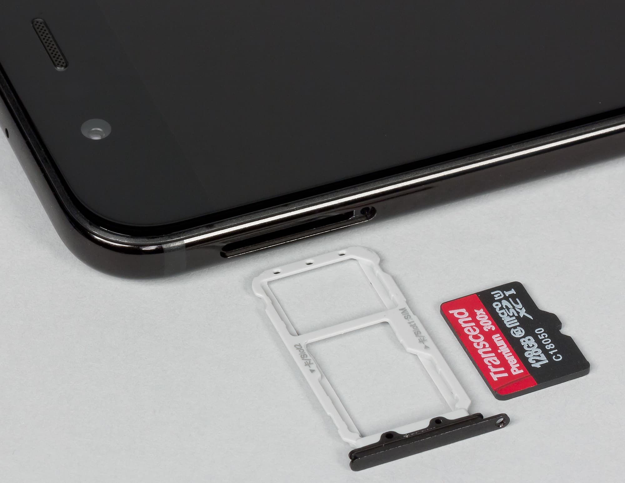 Боковой разъем для карточек гибридный: в один из слотов вставляется карта Nano-SIM, в другой — карта памяти microSD или, в случае модификации Dual SIM, вторая SIM-карта формата Nano-SIM. Салазки не металлические, а пластиковые, в них карточки удерживаются и не выпадают.