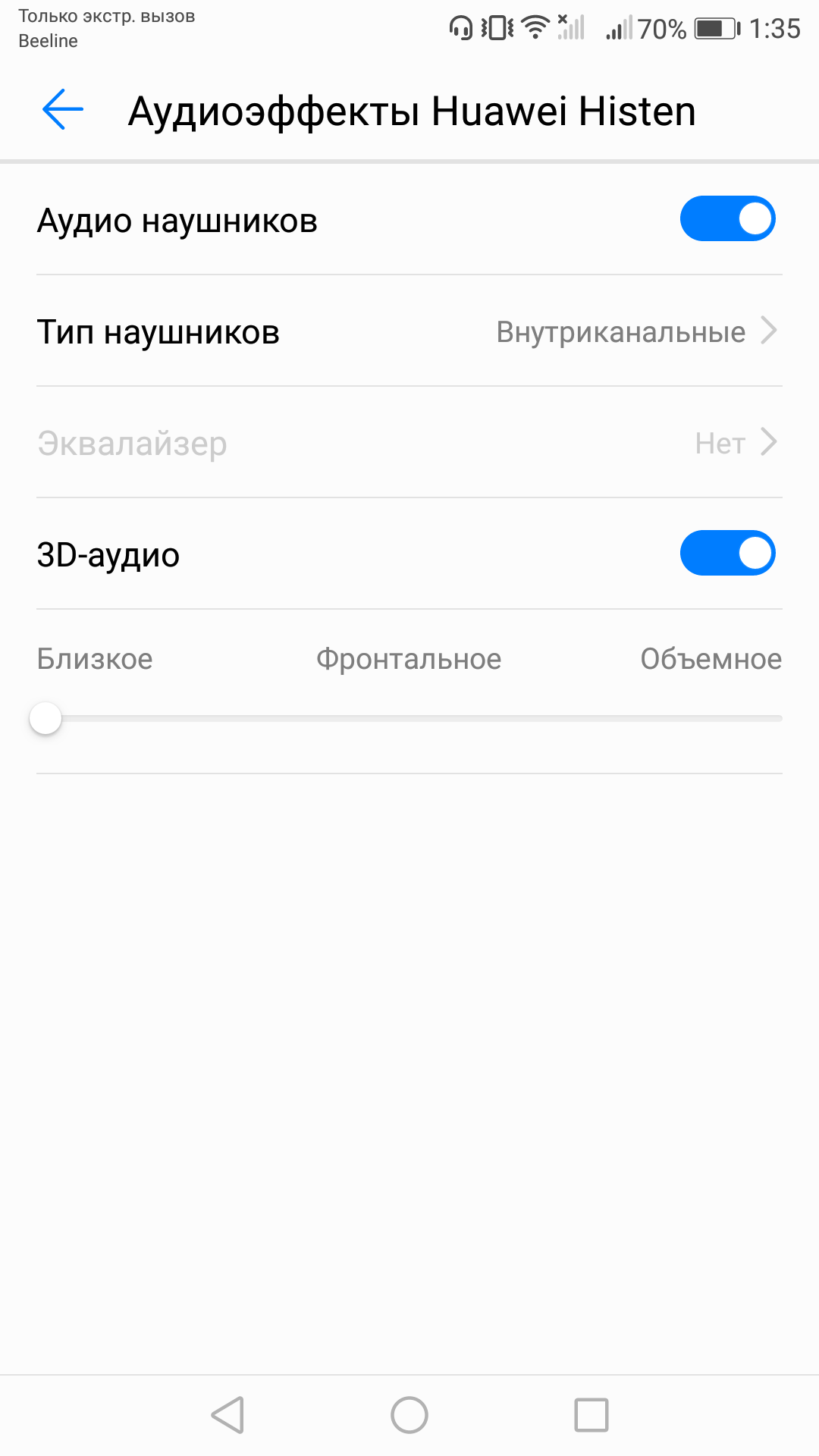 Для прослушивания музыки вместо штатного плеера Google Music используется собственный аудиопроигрыватель со знакомым интерфейсом. Все настройки становятся доступны лишь с подключенными наушниками, в том числе и пресеты эквалайзера. Благодаря выделенному аудиочипу AK4376A звук обладает очень высокой максимальной громкостью, звучание яркое, густое и насыщенное, даже на максимальном уровне динамик не начинает подхрипывать. В наушниках качество даже еще лучше, звук яркий, насыщенный и тоже очень громкий. Для наушников доступен эффект объемного 3D-звука — фирменные функции Huawei Histen.