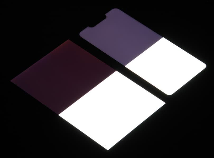 Яркость под углом у экранов уменьшилась (как минимум в 5 раз, исходя из разницы в выдержке), но у Huawei nova 3 экран все же немного светлее. Черное поле при отклонении по диагонали высветляется сильно и приобретает красно-фиолетовый оттенок. Фотографии ниже это демонстрируют (яркость белых участков в перпендикулярном плоскости экранов направлении одинаковая!):