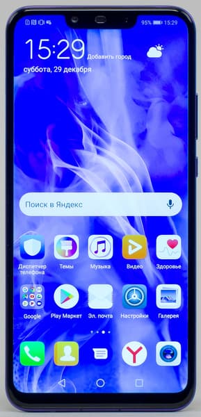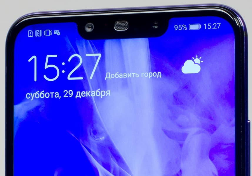 Экран сверху получил вырез в виде классической (довольно большой) «челки» (она же «монобровь»), в нем нашлось место двойной камере и светодиодному индикатору событий, который встроен прямо под решетку разговорного динамика. Углы экрана сильно закруглены.