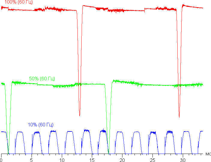 Видно, что на высокой и средней яркости амплитуда модуляции большая, но скважность низкая, в итоге видимого мерцания нет. Однако при сильном понижении яркости появляется модуляция с большой относительной амплитудой и высокой скважностью, ее наличие уже можно увидеть в тесте на присутствие стробоскопического эффекта или просто при быстром движении глаз. В зависимости от индивидуальной чувствительности такое мерцание может вызывать повышенную утомляемость. Впрочем, фаза модуляции различается по площади экрана, поэтому негативный эффект от мерцания снижен.