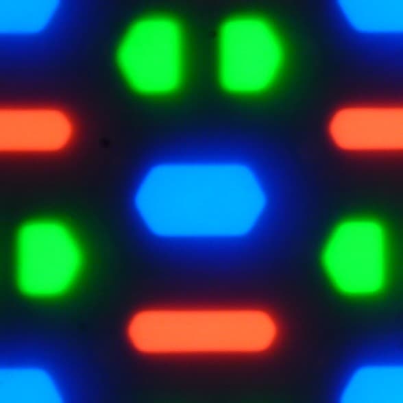 В этом экране используется матрица AMOLED — активная матрица на органических светодиодах. Полноцветное изображение создается с помощью субпикселей трех цветов — красного (R), зеленого (G) и синего (B), но красных и синих субпикселей в два раза меньше, что можно обозначить как RGBG. Это подтверждается фрагментом микрофотографии:
