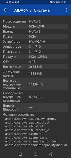 - SoC Huawei Kirin 710 (4×Cortex-A73 @2,2 ГГц + 4×Cortex-A53 @1,7 ГГц)