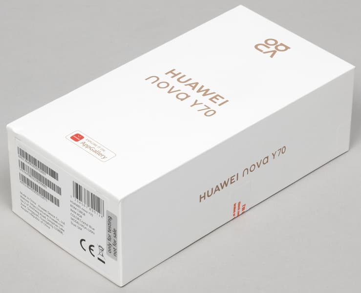 Huawei Nova Y70 поставляется в твердой картонной упаковке, оформленной в максимально лаконичном варианте.