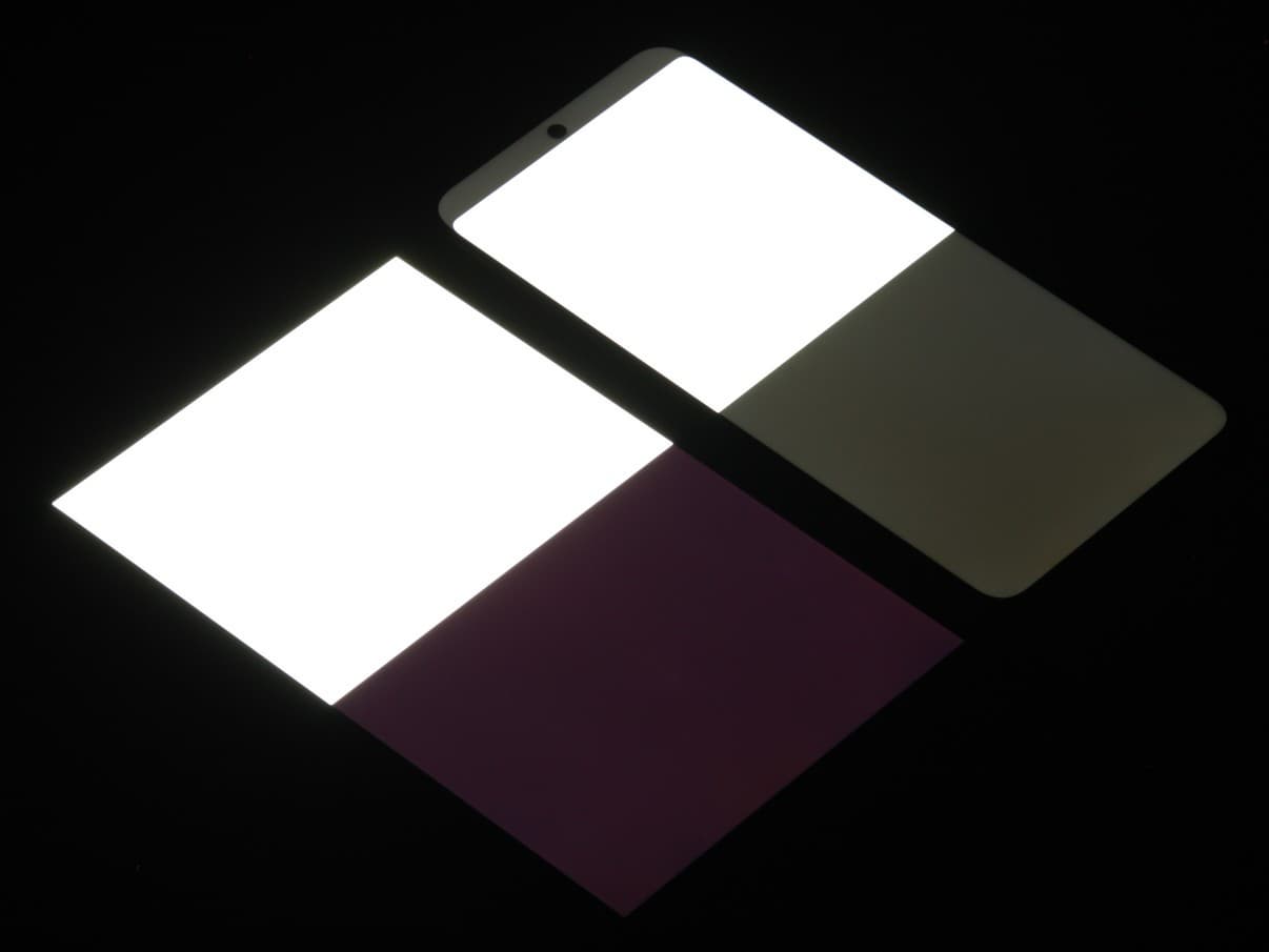 Яркость под углом у экранов уменьшилась (как минимум в 5 раз, исходя из разницы в выдержке), но у смартфона яркость под этим углом заметно ниже. Черное поле при отклонении по диагонали высветляется сильно, но остается условно нейтрально-серым (так видно глазами). Фотографии ниже это демонстрируют (яркость белых участков в перпендикулярном плоскости экранов направлении одинаковая!):