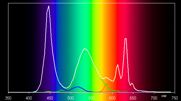 Спектры компонент достаточно хорошо разделены, что и обуславливает широкий цветовой охват. Для потребительского устройства широкий цветовой охват является недостатком, поскольку в итоге цвета изображений — рисунков, фотографий и фильмов, — ориентированных на пространство sRGB (а таких подавляющее большинство), имеют неестественную насыщенность. Особенно это заметно на узнаваемых оттенках, например на оттенках кожи. Результат приведен на фотографиях выше. Впрочем, не все так плохо, при выборе профиля Обычные охват сжимается до границ sRGB: