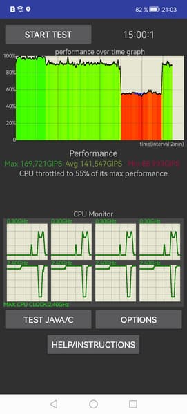 Тестирование традиционно проводилось на обычном уровне энергопотребления без использования функций энергосбережения, хотя таковые в аппарате имеются. Условия тестирования: выставлен минимальный комфортный уровень яркости (примерно 100 кд/м²). Тесты: беспрерывное чтение в программе Moon+ Reader (со стандартной, светлой темой); беспрерывный просмотр видео в HD-качестве (720р) через домашнюю сеть Wi-Fi; игра Injustice 2 с автонастройками графики.